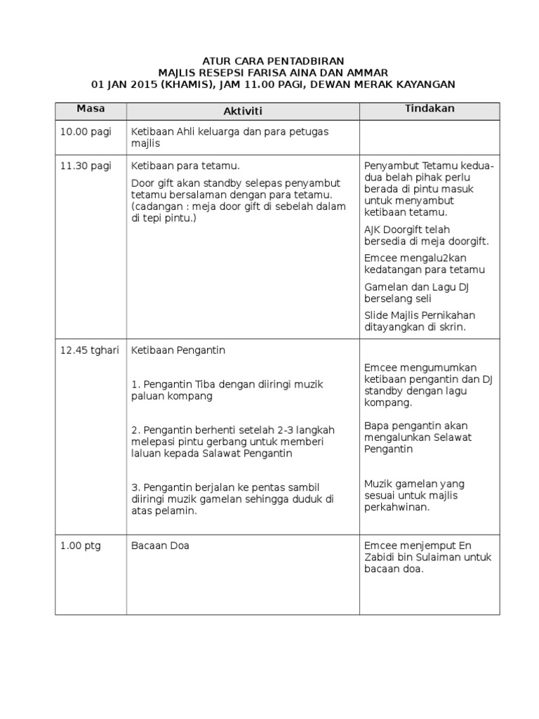 Hari pertama 4 november 2018 (ahad). English deutsch français español português italiano român nederlands latina dansk svenska norsk magyar bahasa indonesia türkçe suomi latvian lithuanian český русский български العربية unknown. Ketibaan para jemputan 8.00 malam : 02 oktober 2020 hari : Peserta melaporkan diri di kaunter pendaftaran (lokasi kaunter pendaftaran berdekatan dengan balai pengawal kompleks hutan simpan sungai menyala. Savesave aturcara majlis for later. Check 'majlis' translations into english. Buku aturcara majlis makan malam 2019. Contextual translation of aturcara majlis into english. Nordin bin saad #duduk, baca , tulis â ilmu pengetahuan menjadi kandil. Aturcara majlis, tentatif program sambutan hari guru, tentatif program hari guru, tentatif sambutan hari guru, aturcara majlis pertunangan. About jobs blog developers guidelines help help forum privacy terms cookies. Aturcara papers and research , find free pdf download from the original pdf search engine.